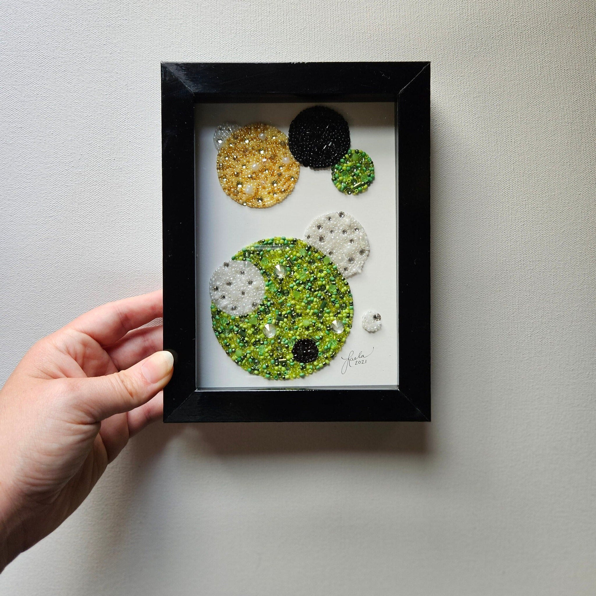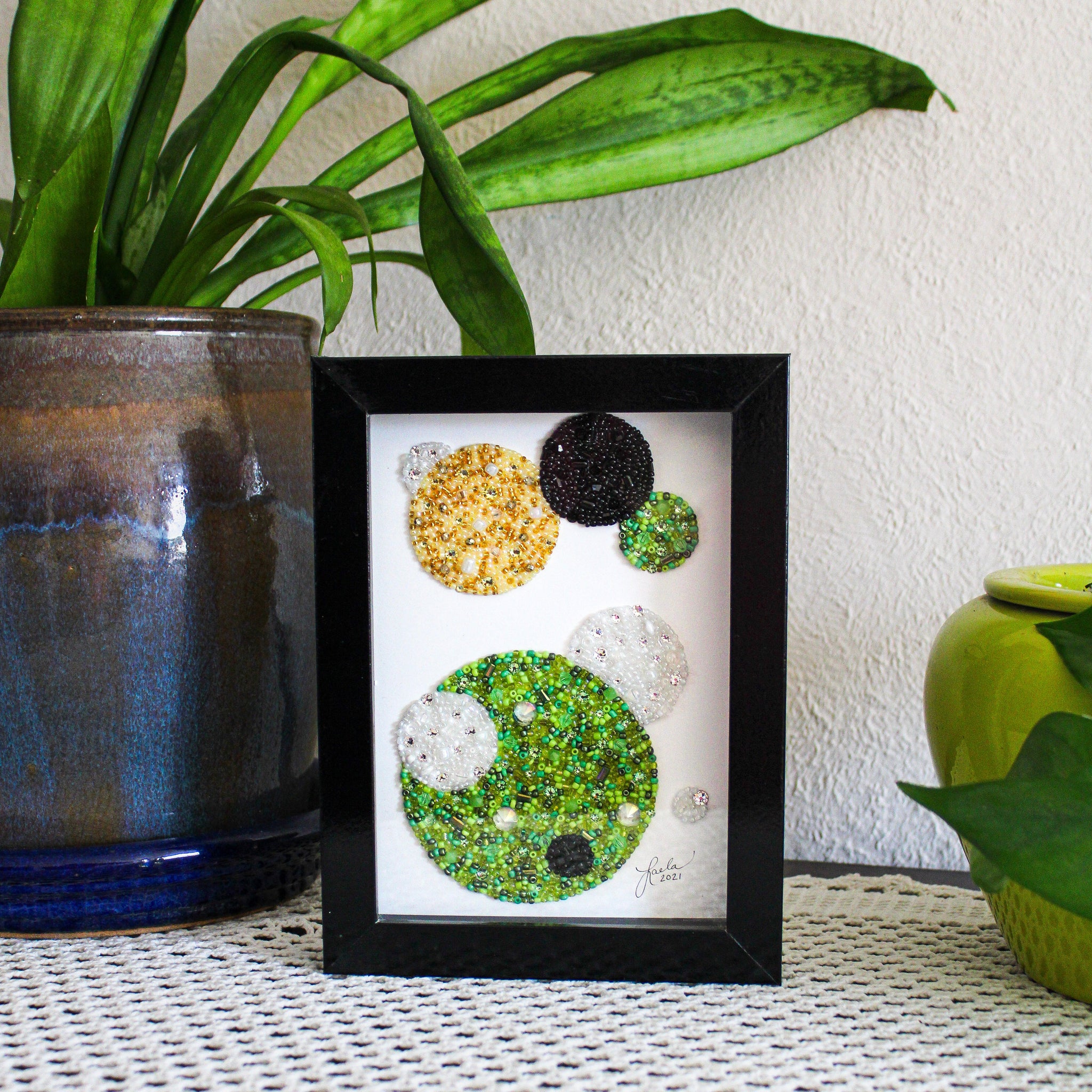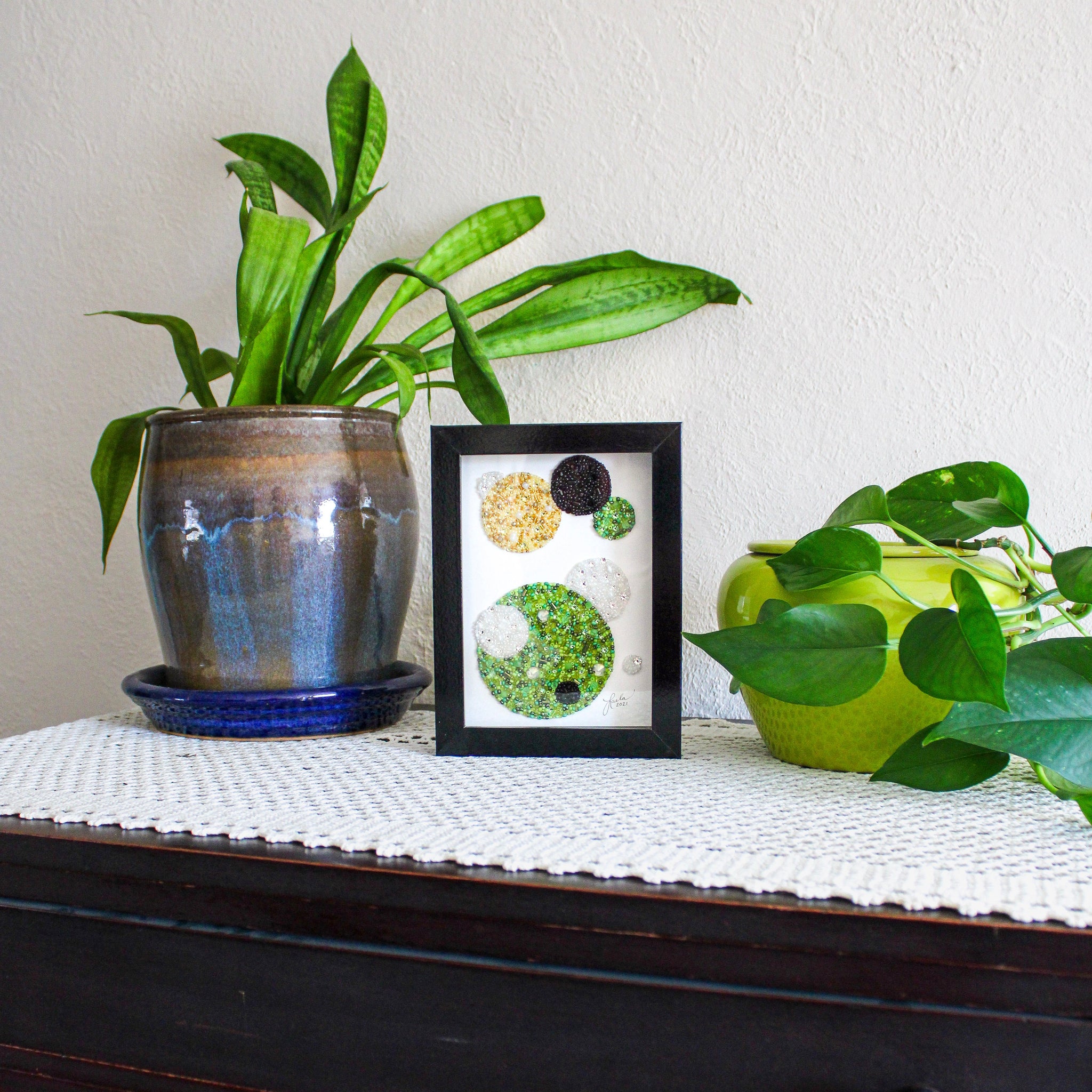 5"x7" geometric circle piece mounted in a black shadow frame as shown.